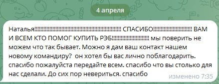 Сообщила вчера военным ребятам наш главный сюрприз - то, что мы им РЭБ купили (Коля вчера "отчитался, что тот уже у него). Сегодня утром, видимо, когда в зоне связи дошло то моё сообщение, прислали ответ. 😁 Очень удивились!!! 😎 Я дала "добро" на общение с их командиром. Пока не связывался. Жду. А вот то, что у ребят НОВЫЙ командир меня очень и очень радует. 👍