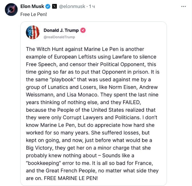 В ответ на пост Илон Маск репостнул призыв Трампа освободить Марин Ле Пен. Ранее суд в Париже запретил ей участвовать в выборах на пять лет, включая президентскую гонку 2027 года. @SPUTNIKBY