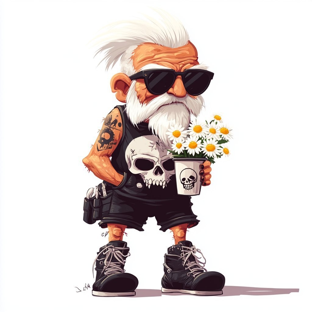 Создано на основе запроса: stylized cartoon illustration of an old man with white beard and sunglasses, wearing punk-style outfit with skull tank top and black shorts, holding daisies in a coffee cup, black combat boots, grungy yet charming vibe, clean white background, humorous character design, exaggerated proportions, on a white background