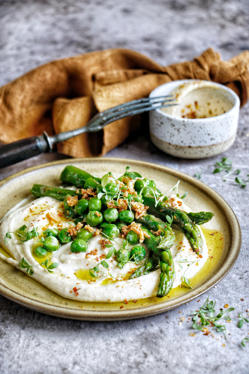 Спаржа - хорошо, хумус - идеально👌🏼 Хумус удачно сочетается со свежими, хрустящими овощами, такими как сельдерей, морковь, огурцы, болгарский перец и др. Но попробуйте его подать с запеченными, жареными или томлеными овощами🤤 Вкус закуски раскрывается совершенно иначе😍 Правда, в таком случае язык не поворачивается назвать это блюдо закуской, думаю, что здесь можно замахнуться на полноценный ужин☺️ Жареная зеленая спаржа с чесноком на сковороде. Ингредиенты: •Хумус 200 гр. •Спаржа свежая 150-200 гр. •Горошек зеленый свежемороженый 50-60 гр. •Сливочное масло 20 гр. •Оливковое масло 1 ст. л. •Чеснок 2 зубчика. •Соль, черный молотый перец по вкусу. •Хрустящий жареный лук (приправа) для подачи. Приготовление: Готовим спаржу: •Спаржу тщательно промываем, отламываем или срезаем твердые концы, отправляем в кипящую подсоленную воду на 1-3 минуты. Перекладываем спаржу в ледяную воду (я добавила кубики льда), чтобы спаржа осталась хрустящей и не потеряла свой ярко-зеленый цвет. •В сковороде