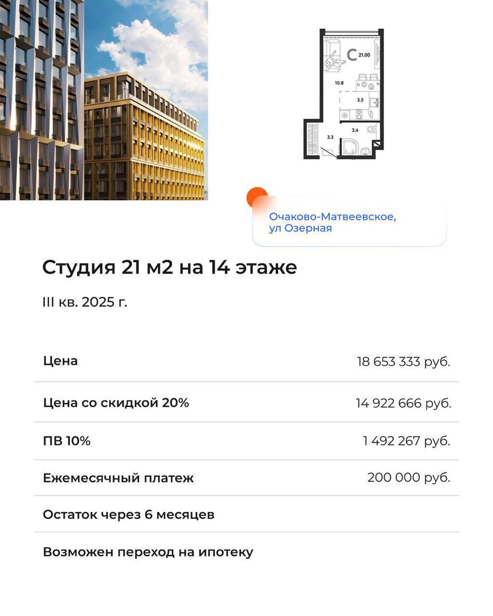 💸 Кейсы по рассрочке на студии 🔥🔥🔥 1. Студия в районе с интеллигентным окружением. Разнообразная инфраструктура. При этом здесь нет перенаселенности, как в спальных районах и транспортных заторов, характерных для центра.  2. Студии в 4*апарт-отеле с гостиничным сервисом в 10 минутах от Ботанического сада, а также несколько торговых центров со всей необходимой инфраструктурой  3. Студия в Раменках в окружении паркового пояса, метро в 5 мин. пешком, пешей доступности различные вузы, школы, детские сады, магазины, кафе, рестораны, салоны красоты. Чтобы подобрать выгодный вариант по классной рассрочке пишите ⚫️ или звоните ⚫️ +7 (926) 345-15-18