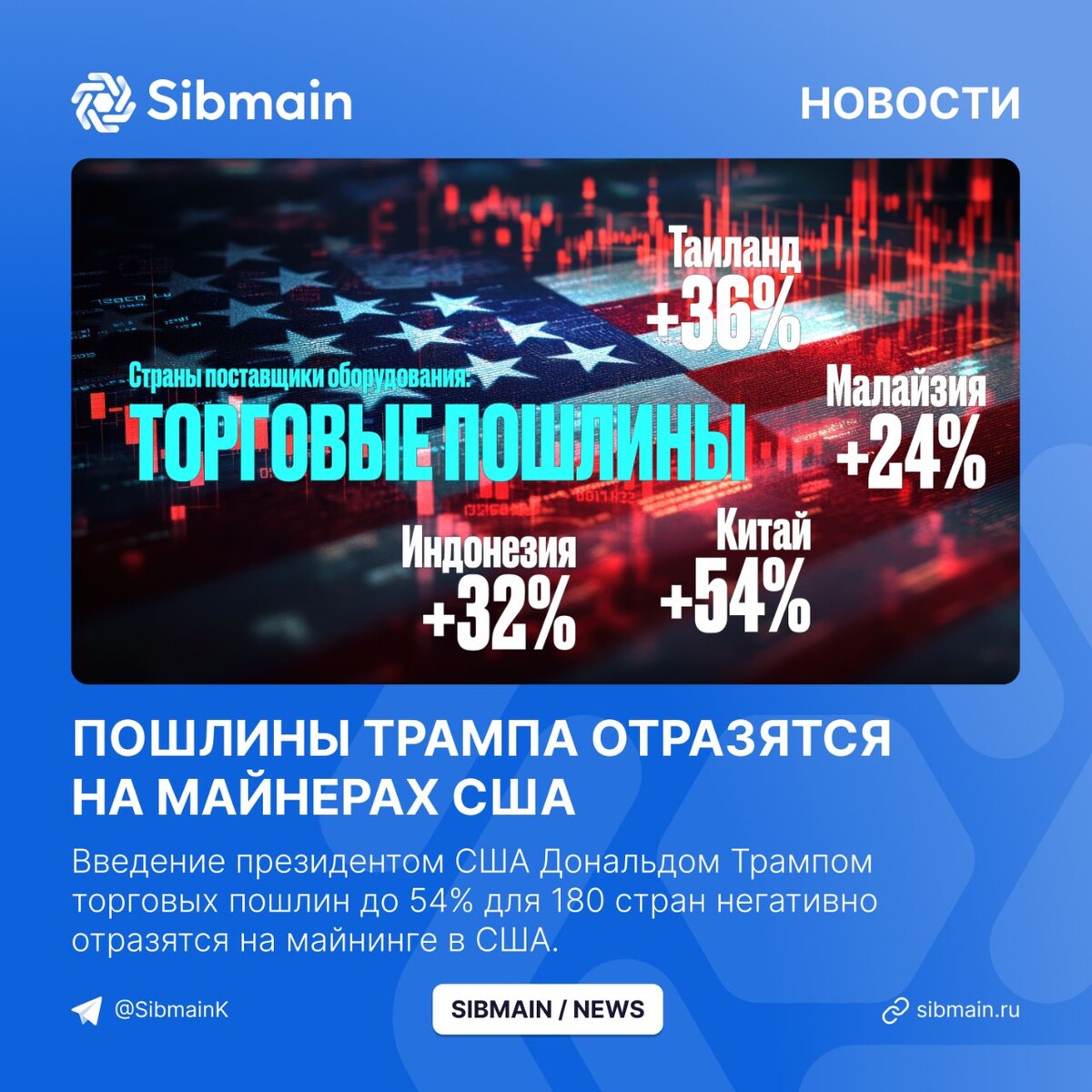 Введение президентом США Дональдом Трампом торговых пошлин до 54% для 180 стран негативно отразятся на майнинге в США.