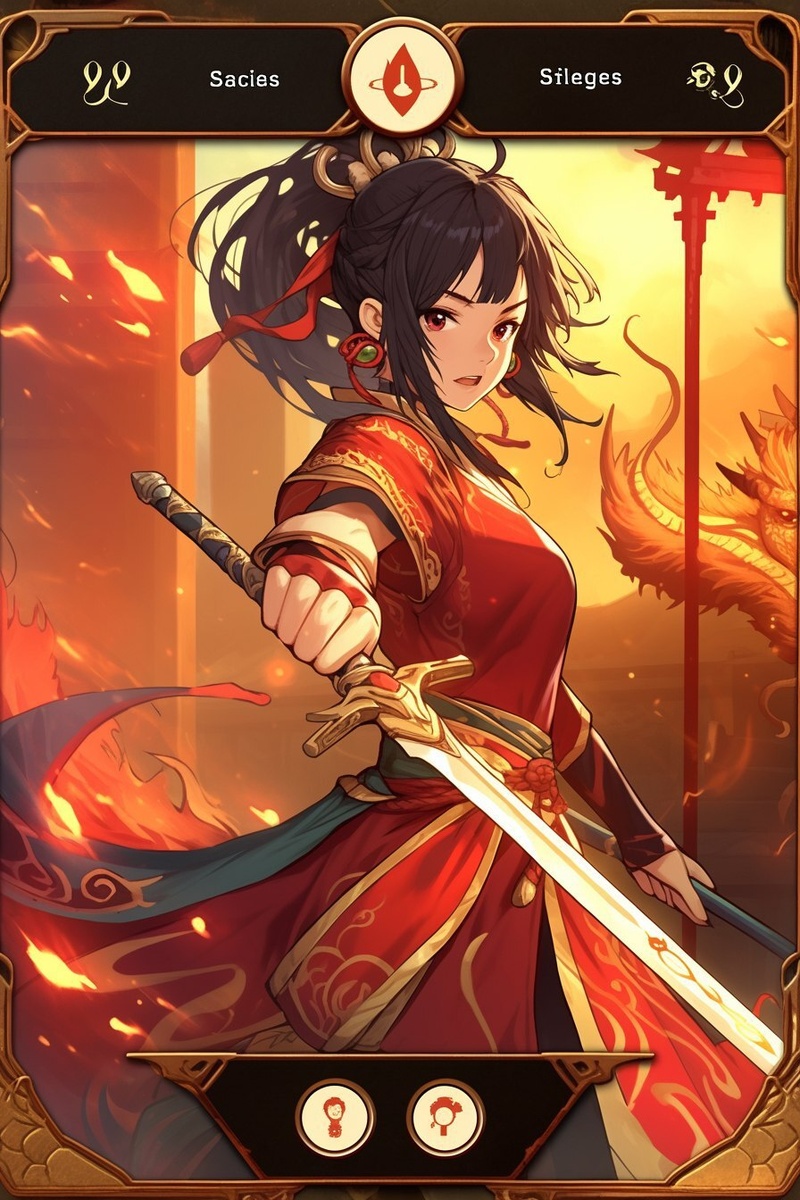 Автоперевод: Азиатская женщина -воин держит пожарный меч, торговую карточку с золотой границей, текстовая поля со статистикой и способностями внизу, дракон на заднем плане