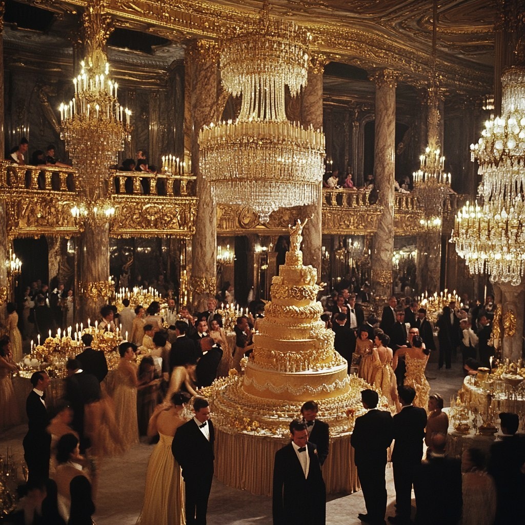 Создано на основе запроса: An extravagant party scene in 1987 Barcelona, a luxurious venue with golden decorations, chandeliers, and a