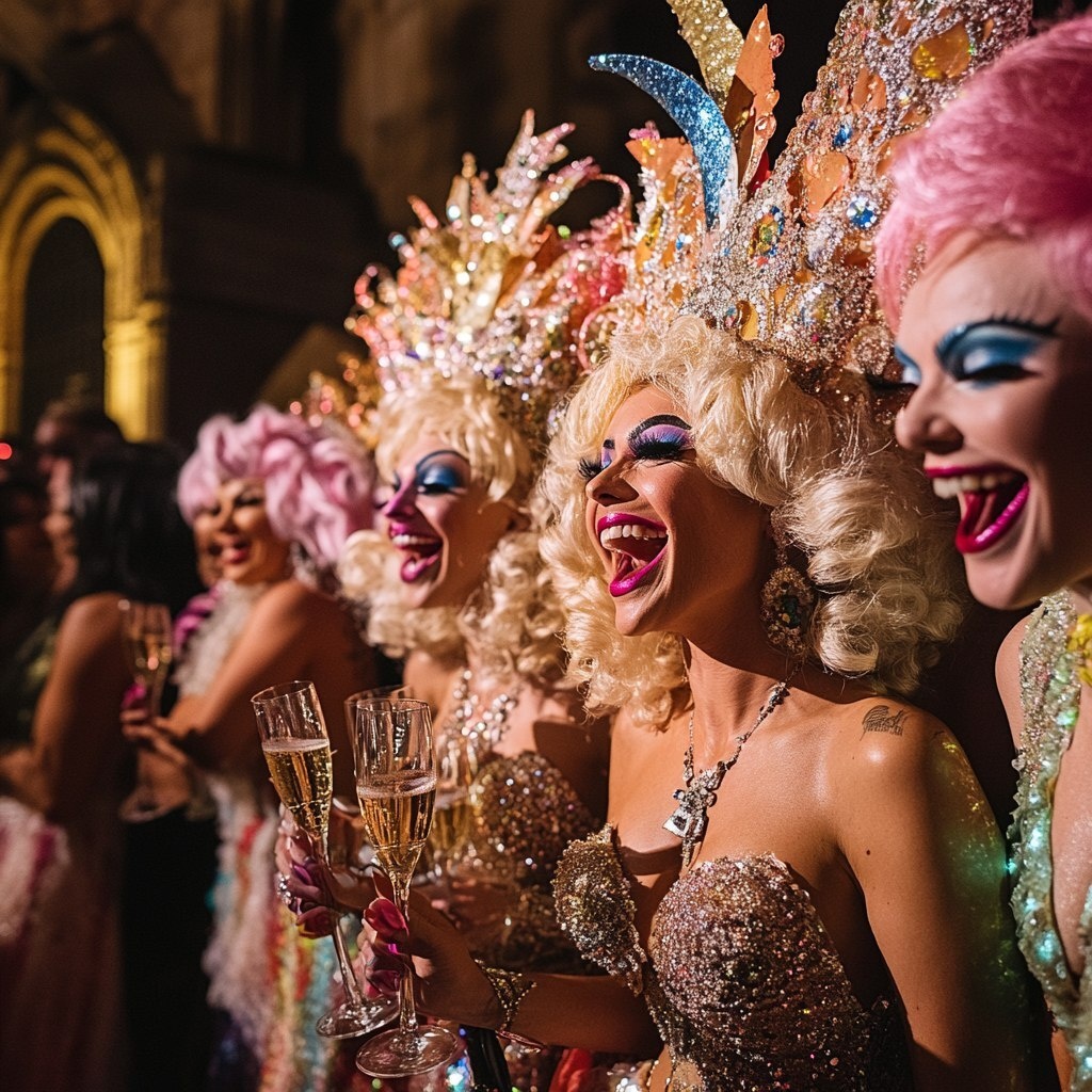 Создано на основе запроса: A group of 100 glamorous drag queens in extravagant costumes, serving champagne in elegant glasses, vibrant and festive atmosphere, guests laughing and celebrating, dynamic composition, cinematic lighting.