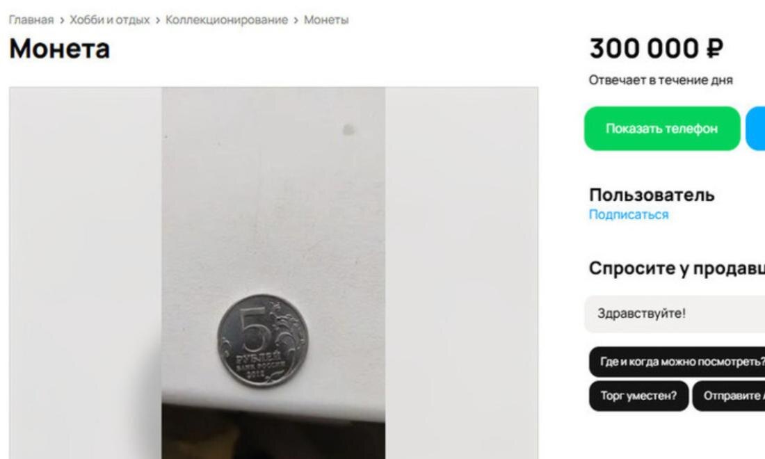В Новосибирске 5-рублевую монету продают за 300 тысяч рублей