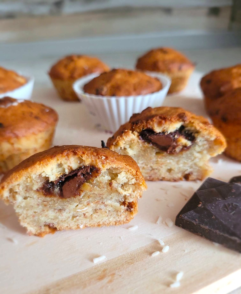 Раскладываем массу по формочкам для кексов, тесто должно занимать примерно 2/3 формы. Формочки можно ничем не смазывать, в тесте достаточно масла. Из 3 бананов у меня получается примерно 8-9 готовых кексов. В серединку можно положить полдольки любимого горького шоколада, а можно обойтись и вовсе без начинки. Далее отправляем кексы в разогретую до 200 градусов духовку на 30-40 минут и наслаждаемся приятным банановым ароматом.