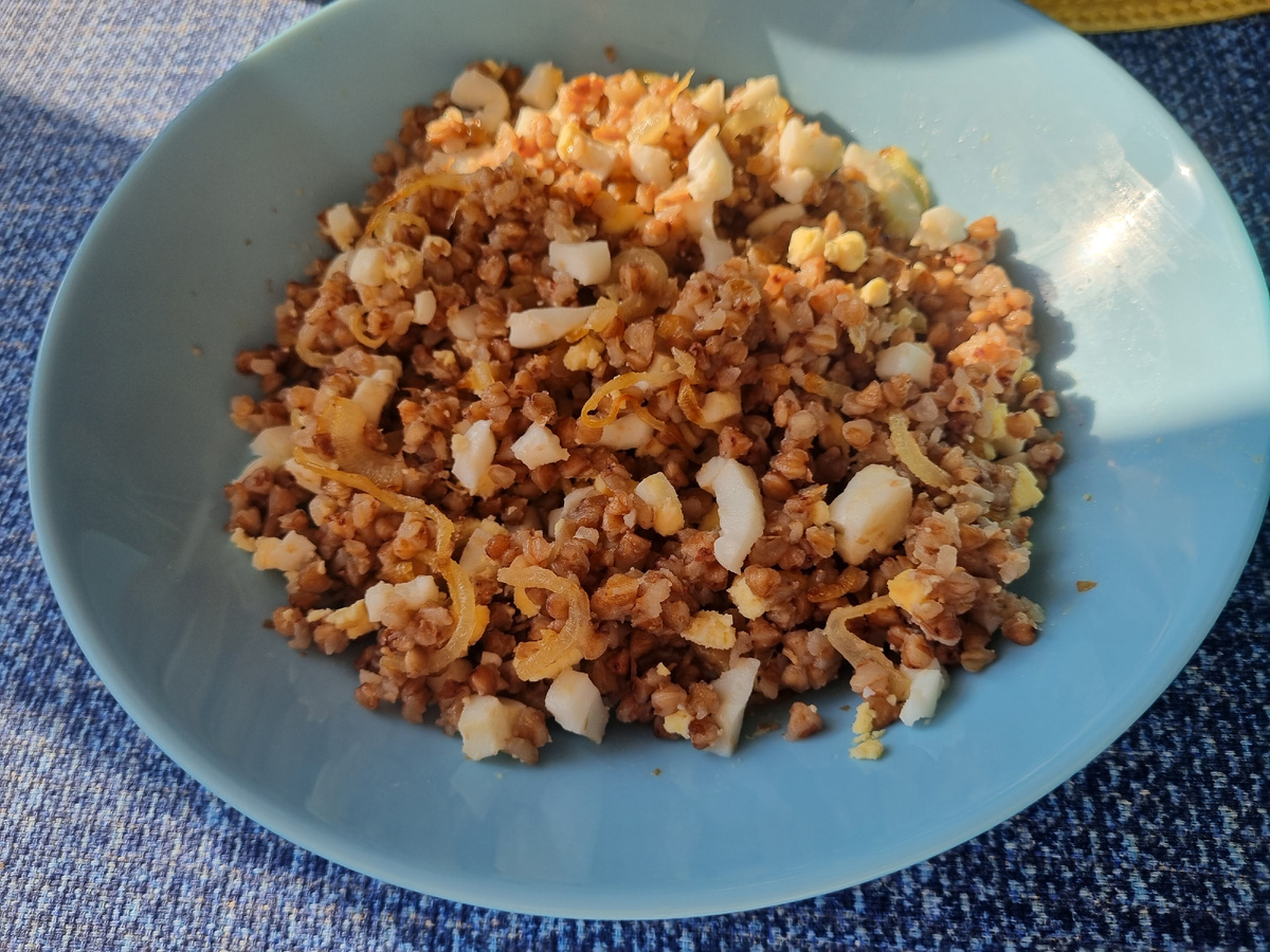 1. Гречневая каша с жареным луком и рубленным яйцом