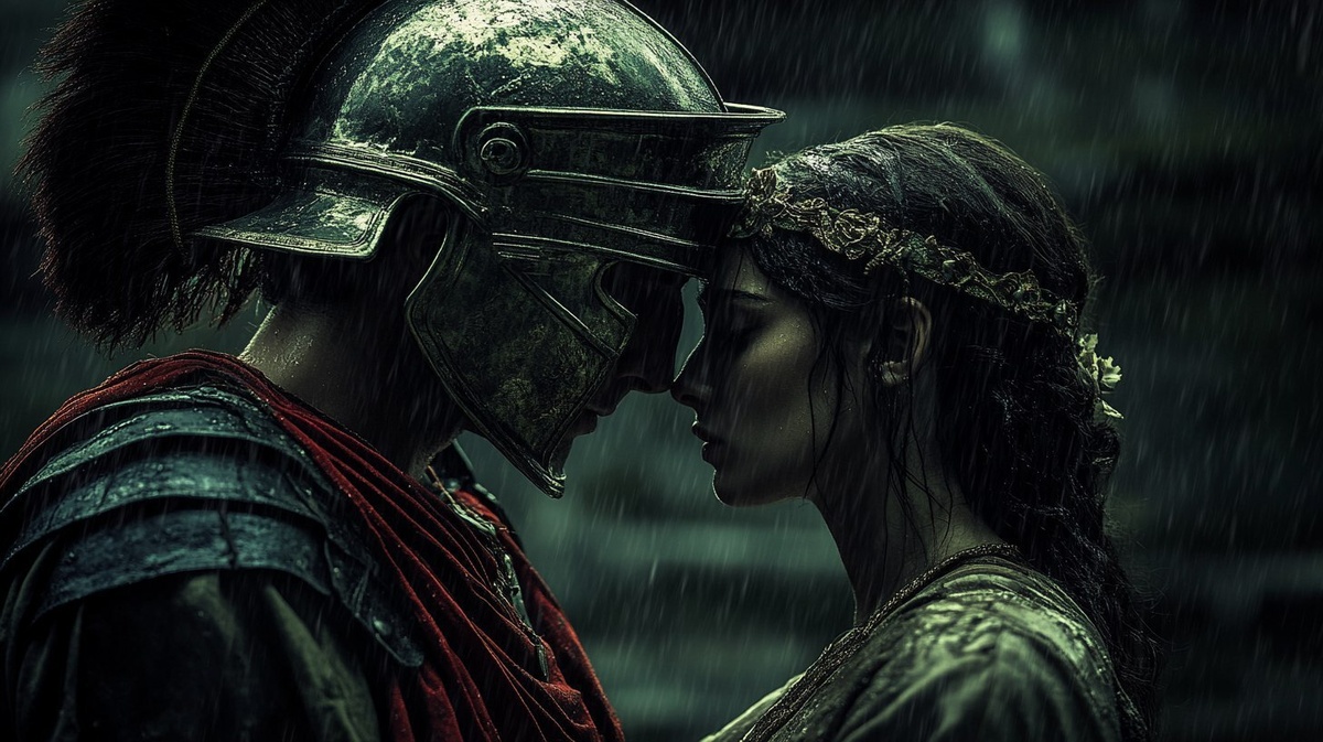 Создано на основе запроса: Realistic photo, a love in Roman times, in raining dark night