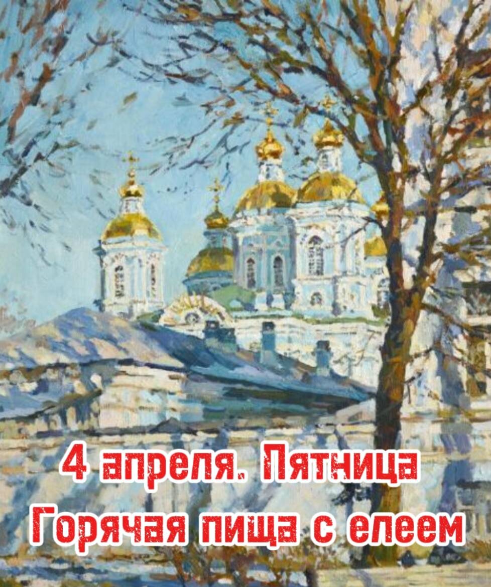 Здравствуйте, мои дорогие! ❤️ Особо разрешите приветствовать тех кто к нам присоединился. Для краткого знакомства с каналом почитайте ⏩️ (https://t.me/pravrecept/3421) это ваше место в первом ряду. Календарь Великого Поста - https://dzen.ru/media/id/63fedc01babcd1299d839d49/osnovnye-daty-velikogo-posta-26-marta-sreda-perepolovine-seredina-67e0f71ddc465328c167602c О логике календаря Великого Поста - https://dzen.ru/media/id/63fedc01babcd1299d839d49/prodoljaem-seriiu-postov-o-poste-post-1-chto-takoe-post-post-2-stepeni-67c347d9e4fc402e2ee8d492 Сегодня 4 апреля. Пятница Великий Пост Степень поста - Горячая пища с растительным маслом (канун Похвалы Пресвятой Богородицы) по Афонскому Уставу. Завтра: Великий Пост Степень поста - Горячая пища с растительным маслом С именинами поздравляем: Жен.: Дарья, Василиса, Таисья Муж: Василий, Исакий Спаси Господи! 🙏 На заставке: «Весной у Никольского собора» Автор: Еськов Павел Ваш ПП - Православное Питание - канала о пище не только телесной,