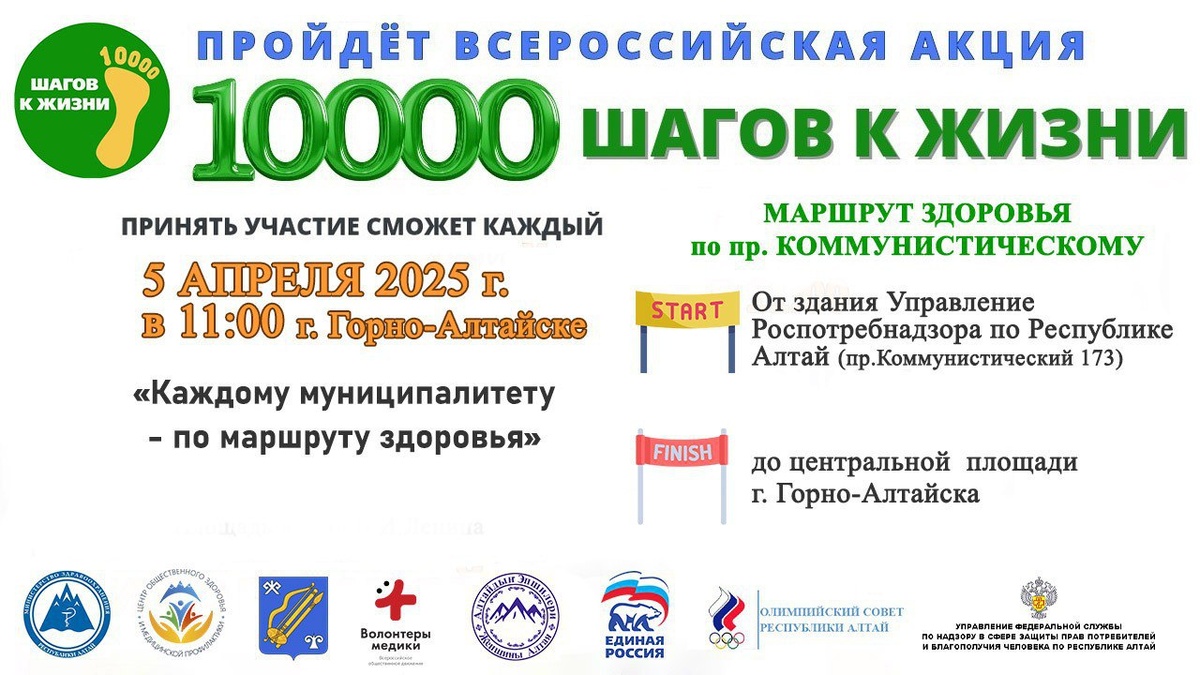📆5 апреля в 11:00 в Горно-Алтайске, пройдет акция 10 000 шагов к жизни «Каждому муниципалитету – по маршруту здоровья», приуроченная к