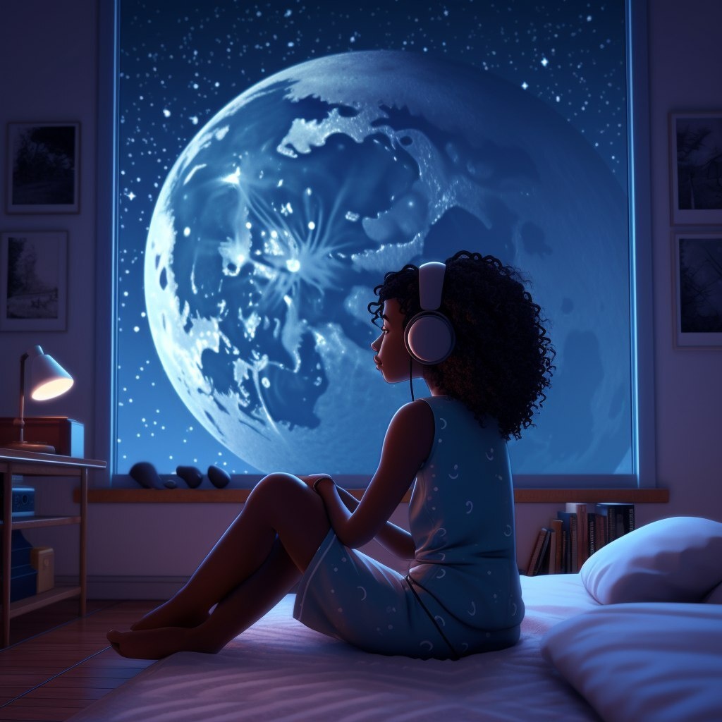 Автоперевод: Лофи Фон в комнате, показывающая луну и звезды с черной девушкой, слушая наушники