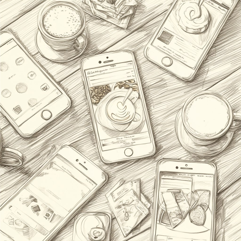 Создано на основе запроса: A seamless hand-drawn pencil sketch illustration of multiple smartphones displaying coffee recipes, arranged on a wooden café table, soft organic lines, minimal shading, warm and natural tones, cozy and inviting atmosphere, full-frame composition, no empty spaces, simple and elegant design