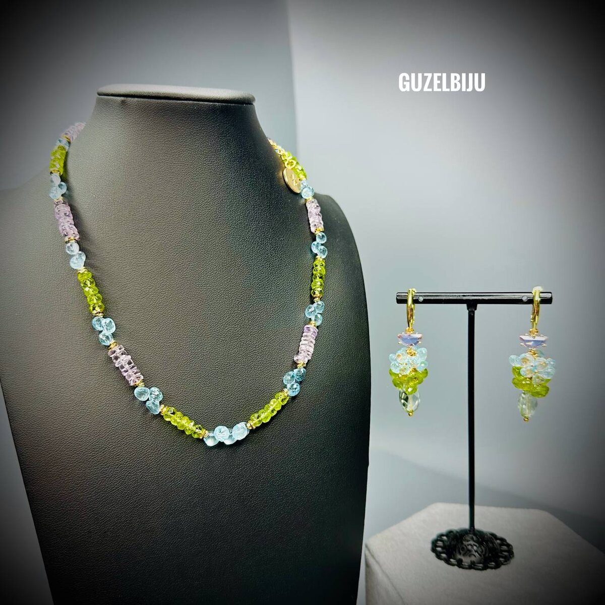 Ювелирного качества камни, идеальная сборка, лучшая фурнитура для современно и дорогой бижутерии (без ржавчины и потери вида). Луковки топазов Индия, нежного голубого цвета, луковки чистого хризолита, в серьгах празиолит в огранке. В ожерелье чистые нежные аметисты. Комплект у хозяйки. 7 апреля будут выставлены примерные варианты сережек в таких оттенках, можно заказать индивидуальные варианты, пока с ними работаю и готовлюсь.