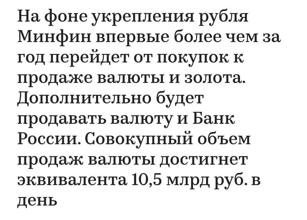 Минфин впервые за год перейдёт к продаже валюты и золота, приобретенных ранее в рамках бюджетного правила. Вместе с ним будет продавать валюту и ЦБ. Общий ежедневный объем продажи валюты составит ₽10,5 млрд.
