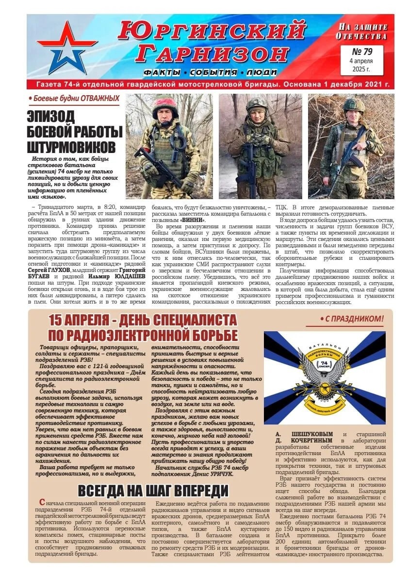 В редакцию отправили заметку из газеты «Юргинский гарнизон» № 79 от 4 апреля 2025 года с описанием подвига нашего героя СВО сержанта Григория Бугаева https://ok.ru/profile/566281915533. Это армейская газета, посвященная 74-й отдельной гвардейской мотострелковой бригаде, выполняющая роль информационного бюллетеня о боевых действиях и повседневной жизни военнослужащих. Приводим его полностью: ЭПИЗОД БОЕВОЙ РАБОТЫ ШТУРМОВИКОВ История о том, как бойцы стрелкового батальона (усиления) 74 омсбр не только ликвидировали угрозу для своих позиций, но и добыли ценную информацию от пленённых ими «языков». - Тринадцатого марта, в 8:20, командир расчёта БПЛА в 50 метрах от нашей позиции обнаружил в руинах здания движение противника. Командир принял решение сначала обстрелять предполагаемую вражескую позицию из миномёта, а затем поразить при помощи дрона-«камикадзе» и запустить туда штурмовую группу из числа военнослужащих с ближайшей позиции. После огневой подготовки и «камикадзе» рядовой Сергей