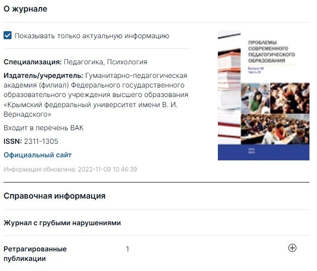 Проблемы современного педагогического образования Специализация: Педагогика, Психология Издатель/учредитель: Гуманитарно-педагогическая академия (филиал) Федерального государственного образовательного учреждения высшего образования «Крымский федеральный университет имени В. И. Вернадского» Входит в перечень ВАК https://www.dissernet.org/magazine/problemy_sovremennogo_pedagogicheskogo_obrazovaniya