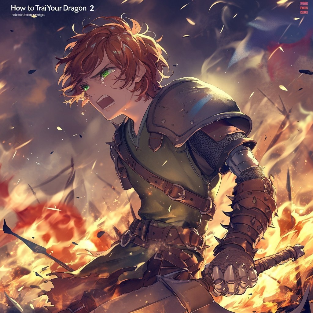 Автоперевод: Стиль аниме, икота ужасная видация III из фильма «Как тренировать своего дракона 2», плачущего, со слезами, молодым викингом вокруг 20-летнего, красивых взглядов, формы тела с тилмом и окрашенных волос, светло-кожи, коричневых видов, зеленых цветов, примерно 185 км, с протезом левой ноги, в сфере боевого поля, огня и руины, Трэгские атмосферы, 8