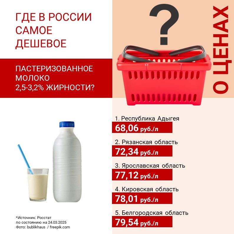 «Центр Агроаналитики» определил регионы с самыми низкими потребительскими ценами за литр пастеризованного и ультрапастеризованного молока 2,5-3,5% жирности. В рейтинге доступности такой продукции для населения оказалась Кировская область ПФО. Кроме того, наиболее выгодная стоимость пастеризованного молока установилась в Республике Адыгее ЮФО и ряде областей ЦФО: Рязанской, Ярославской, Белгородской. Экономные покупки ультрапастеризованного молока совершали также жители некоторых субъектов ПФО: Мордовии, Башкортостана, Оренбургской области — и Волгоградской области ЮФО.