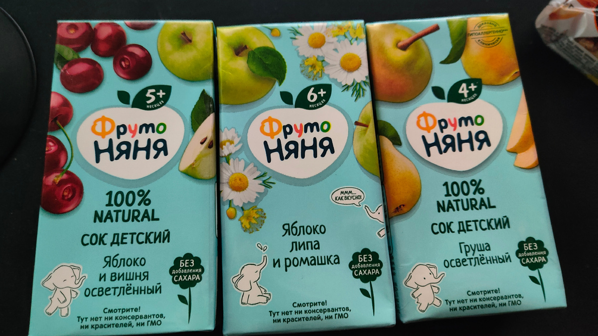 Во многих магазинах Вы видели отдельные стеллажи с детским питанием, вот на один из таких я наткнулся в сети магазинов "Пятёрочка". Не долго думая решил приобрести некоторую продукцию от бренда "ФрутоНяня". Сначало рассмотрим некоторые соки, нектары я не стал покупать, так как не особо их люблю, а вот соки привлекли тем, что они без добавления сахара. Цена данного продукта примерно 33 рубля за 0.2 литра. Как мы видим подходит для питания детей от 4-6 месяцев, все зависит от вкуса. На бумаге состав хороший, тут вопрос не возникает. Выбираю именно те соки в которые не добавляют сахар. 1. Яблоко и вишня. Обязательно проверяйте в магазинах течет сок или нет, так как в моем случае сразу первые три пакета капали сквозь фольгу, в итоге я купил, который все равно чуть-чуть капал. Очень вкусный сок, как будто взял из погреба домашний. Негатив только из-за упаковки, а по вкусу все на высшем уровне. Вишня сквозь вкус яблока чувствуется и это явный плюс. 2. Груша. Никогда не покупал раньше соко