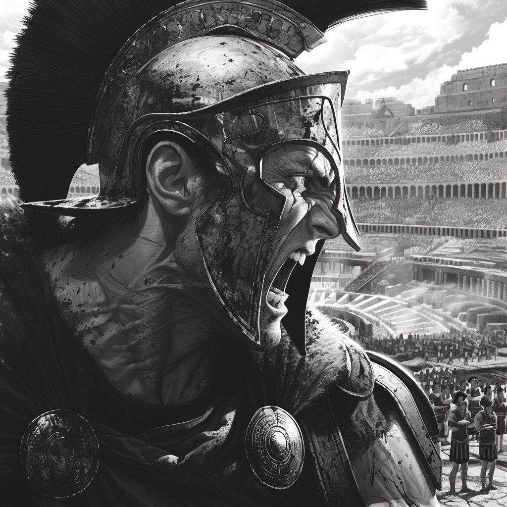 Создано на основе запроса: Ancient angry man with spartan helmet and armor with white eyes, profile view, close up to middle body, coliseum