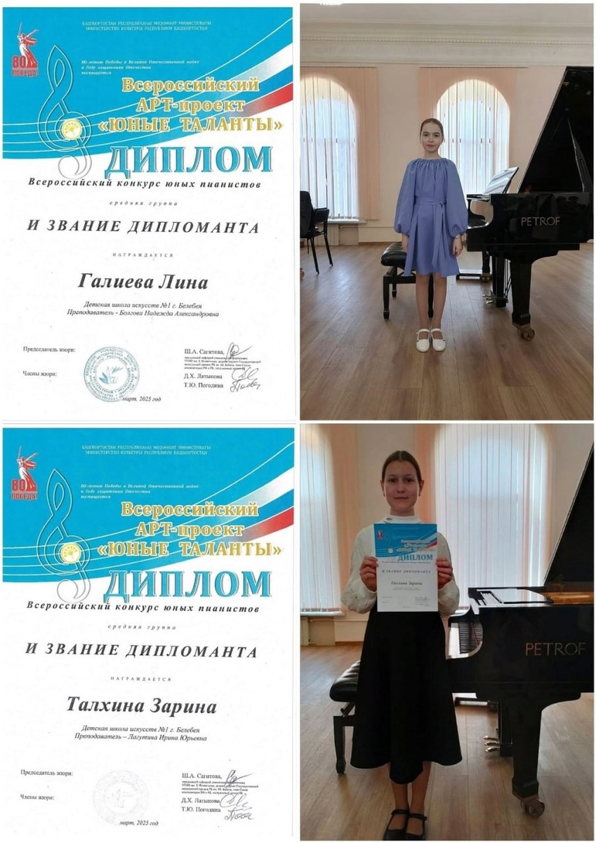 🔔Учащиеся Детской школы искусств №1 города Белебея успешно выступили в семи номинациях Всероссийского АРТ-проекта «Юные таланты», который был посвящен 80-летию Победы в Великой Отечественной войне и Году защитника Отечества. Они завоевали 13 наград!