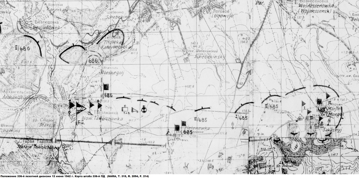 Готовясь к отражению советского контрнаступления, в ночь на 12 июня вся 336-я пехотная дивизия перешла к обороне: в районе хутора Марьин – 687-й пехотный полк, на высоте 184,4 к западу от Марьина – 3-й батальон 685-го пехотного полка, на высоте 163,7 – 1-й батальон 685-го ПП, на высоте 167,3 (севернее совхоза Плетеновка) и восточнее нее – 2-й батальон 685-го ПП, в районе отметки 126,8 в 1 км восточнее Новой Таволжанки – сводный отряд Пюрера (336-й противотанковый батальон без одной роты и 336-й саперный батальон без одной роты), в лесах у Титовки и далее вдоль Северного Донца – 686-й пехотный полк. В 22.15 11 июня боевым приказом № 24 командира 8-го армейского корпуса 336-й пехотной дивизии была также переподчинена находящаяся в Волчанске на усилении 113-й пехотной дивизии батарея 244-го батальона штурморудий, а также подчинена 88-мм зенитная батарея 1-го дивизиона 12-го зенитного полка. Для сокращения растянувшей линии обороны 336-й ПД весь ее левый фланг от Волково до Шебекино (южное) должна была принять вводимая в бой из армейского резерва 389-я пехотная дивизия, которая только с 13.00 12 июня была подчинена штабу 8-го АК. Однако до ее прибытия отражать готовящееся советское контрнаступление 336-я пехотная дивизия должна была только собственными силами.