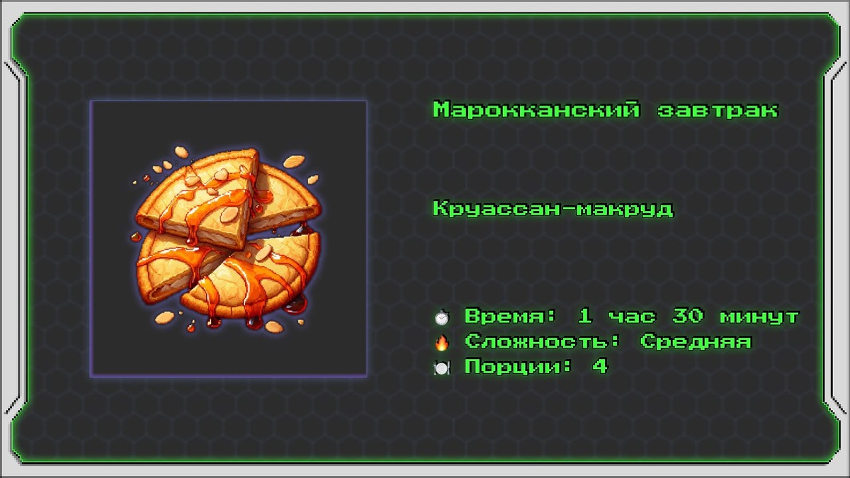 Марокканский завтрак Хрустящие булочки с апельсиновой цедрой и миндальной начинкой (Круассан-макруд) Этот рецепт представляет собой креативную интерпретацию традиционных марокканских сладких булочек макруд. Вместо классической начинки из фиников используется миндальная паста с добавлением апельсиновой цедры, что делает их особенно ароматными и подходящими для завтрака. Информация о рецепте: ⏱️ Время: 1 час 30 минут 🔥 Сложность: Средняя 🍽 Порции: 4 Ингредиенты: Для теста: • 🍚 Мука — 250 г • 💧 Вода (тёплая) — 150 мл • 🌿 Апельсиновая цедра (натёртая) — 1 чайная ложка • 🫒 Растительное масло — 2 столовые ложки • 🧂 Соль — щепотка Для начинки: • 🌰 Миндаль (молотый) — 100 г • 🍯 Мёд — 2 столовые ложки • 🌿 Корица молотая — ½ чайной ложки • 🍋 Лимонный сок — 1 чайная ложка Для жарки: • 🫒 Растительное масло — для фритюра Для подачи: • 🍯 Дополнительный мёд — для поливания • 🌰 Обжаренный миндаль — для украшения Приготовление: Шаг 1: Подготовка ингредиентов 1. Натрите цед
