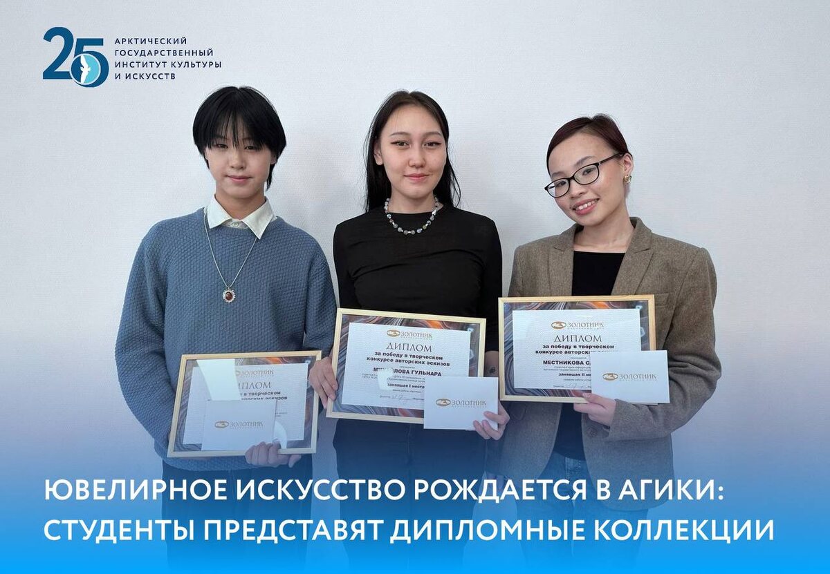 🎓Дипломная работа станет эксклюзивной ювелирной коллекцией В Якутске состоялось награждение финалистов конкурса эскизных работ «Золотник-вместе 25 лет» среди художников-ювелиров. Второе место заняла студентка 4 курса кафедры дизайна и декоративно прикладного искусства АГИКИ Саяна Местникова. Жюри конкурса высоко оценило дипломный проект начинающего ювелира-дизайнера. Представленная коллекция получила название «Следы». «Коллекция «Следы» рассказывает о времени, о жизни, о связи человека с этой землей. Концепция коллекции строится на идее контраста и переплетения. Следы рассказывают о разных аспектах жизни в Якутии: от традиционного уклада, связанного с природой, до современной городской суеты. Они говорят о преемственности поколений и о стремлении к гармонии между прошлым и будущим. «Следы» – это запечатленное в металле то, что обычно исчезает бесследно, память о мимолетном, воплощенная в вечном», – рассказала о смысловом значении своей работы Саяна Местникова. Радость от победы в
