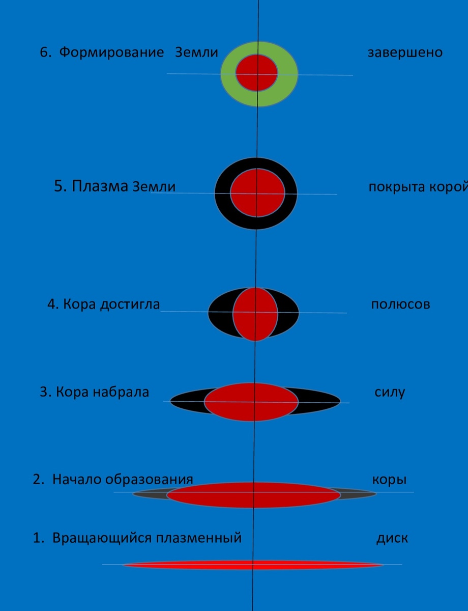 Одной из многих сформировалась наша Солнечная система. Выброшенная плазма из черной дыры, в силу своей не симметричной формы, получила вращение, которое из бесформенной массы образовало диск плазмы с очень высокой температурой. Рис. 1. Как и все тела в космосе, наш диск остывал. Снижение температуры, в первую очередь, сказалось на периферии, на кромке диска. Рис.1. Кромка постепенно затвердевала, превращаясь в «обруч». Рис. 1. В соответствии с законом теплового увеличения (уменьшения) тел, кромка диска уменьшает свой диаметр, чем создает давление на его внутреннюю часть. Чем больше остывает кромка диска, тем сильнее она сжимает находящуюся в его пределах плазму. Центробежные силы диска уже не могут препятствовать уменьшению диаметра диска. Со временем, внутри кромки диска уже не плазма, а жидкая магма, которая вынуждена перетекать в выпуклости, к будущим полюсам. Все больше остывает тело, все больше твердеет кромка, но это уже не кромка, а широкий обруч. Его диаметр продолжает уменьшаться. Из-за этого выпуклости растут, из которых температура, центробежная сила и гравитация формируют шарообразную планету. Рис.1.