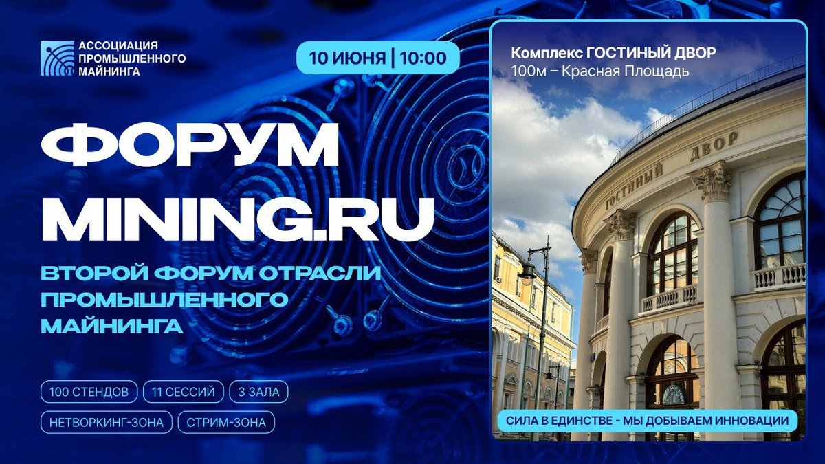 🔥10 июня 2025 года в Гостином дворе (г. Москва, ул. Ильинка, 4) состоится второй форум отрасли промышленного майнинга Mining.ru. ⚡️Форум Mining.ru – ключевая дискуссионная площадка для обсуждения актуальных вопросов развития отрасли промышленного майнинга в России, обмена лучшими практиками и компетенциями. 🏆 Что ждёт участников: - 4500+ участников - огромная экспозона (100 стендов) с компаниями из более чем из 30 регионов и иностранных государств - 3 сцены с насыщенной программой и 11 тематических сессий - 70 спикеров среди которых ведущие игроки отрасли майнинга, представители региональных и федеральных органов власти, эксперты индустрии финтех, искусственного интеллекта, энергетического сектора и других отраслей экономики - звездный модератор - зона нетворкинга и комфортный стриминг-рум; - нетворкинг-пати с VIP-гостями и лидерами отрасли — отличная возможность завязать важные связи в неформальной атмосфере! 📃Регистрация и подробности: Mining.ru Партнёрство и сотрудничество