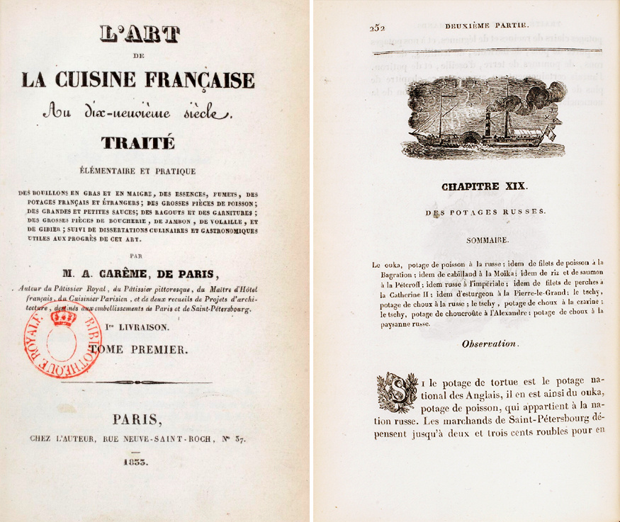Давайте перенесемся в 1835 года и заглянем в книгу Мари-Антуан Кареме "L'Art de la cuisine française au 19ième siècle". Книга посвящена исключительно супам, которые тот обожал.