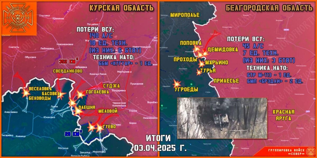 Военные РФ выбивают врага из Гуево и хутора Олешня, но противник не прекращает контратаки в направлении Веселовки. Однако они безуспешны. Так, в направлении Веселовки выдвинулась группа ВСУшников из села Водолаги, которая была уничтожена в результате комплексного огневого поражения. «На оккупированных территориях Суджанского приграничья противник оказывает наиболее ожесточенное сопротивление в районе хутора Олешня и вдоль дорожного направления из Гуево на Горналь. Северяне уничтожают элитные штурмовые подразделения ВСУ. Российские штурмовики в Сумской области на квадроциклах атакуют в районе Басовки.