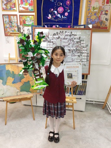 «Мы – продолжатели рода, сохраним язык, веру», – говорит Залина Габитова, приехавшая с Дипломом 2 степени с конкурса «Моя родословная», проведенного Казанским кооперативным институтом в Центре татарской культуры. Залина – ученица 4 класса гимназии имени Наби Даули. К этому очень сложному конкурсу ее подготовили семья и классный руководитель. Пожелаем новых успехов девочке, сумевшей составить очень красивую родословную, включающую шесть поколений, и увлекательно рассказать о ней.