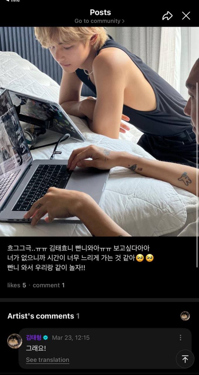 Привет, друзья! Неожиданно, вчера, 23 марта на Weverse появился Ким Тэхён и навёл суету, что вызвало среди АРМИ и радость и волнение!