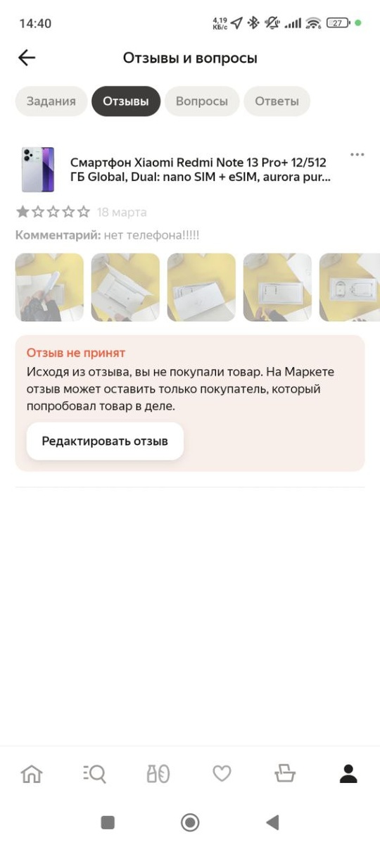 - На маркете может оставить отзыв только покупатель, который попробовал товар в деле. А как я его попробую, если он мне даже не приехал? Это цирк какой-то, - комментирует молодой человек.