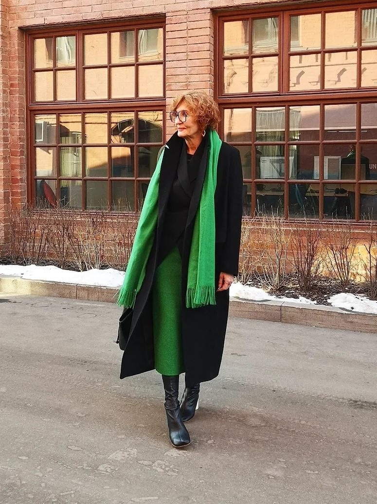 В основе у многих образов есть "вечное" черное пальто миди прямого кроя. Придать ему весеннего настроения можно с помощью ключевых элементов насыщенного зеленого цвета: юбки-миди и длинного шарфа с бахромой. Черные кожаные ботильоны на устойчивом каблуке завершают цветовую гамму и добавляют современности. Этот образ показывает, как можно эффектно использовать яркий цветовой акцент, сохраняя при этом общую сдержанность и изысканность. Он подходит для различных ситуаций, будь то деловая встреча или прогулка по городу.