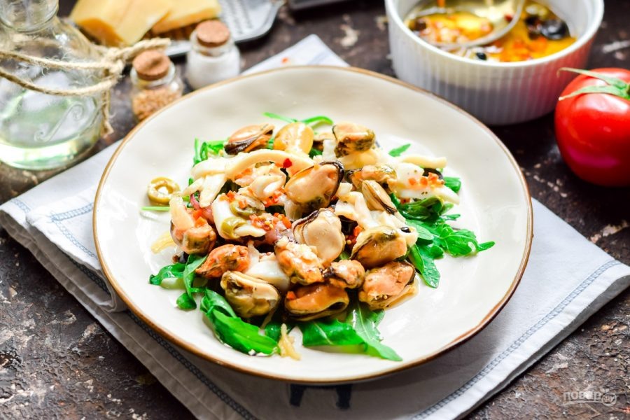 Это легкое и вкусное блюдо, которое подойдет как для ужина, так и для романтического обеда. - Морской коктейль (кальмары, креветки, мидии, осьминоги) - 300 г - Помидоры черри - 200 г - Рукола - 100 г - Пармезан - 100 г - Лимон - 1 шт - Соль, перец, специи по вкусу 1. Морской коктейль разморозьте и хорошо промойте. 2. Помидоры черри разрежьте пополам. 3. Пармезан натрите на мелкой терке. 4. В глубокой миске смешайте морской коктейль, помидоры и рукколу. 5. Приготовьте заправку: выжмите сок лимона, добавьте соль, перец и любимые специи. 6. Заправьте салат и аккуратно перемешайте. 7. Посыпьте тертым пармезаном перед подачей. Советы: - Для заправки можно использовать не только соль и перец, но и добавить розмарин, кориандр или прованские травы для более насыщенного аромата - Помидоры черри можно заменить обычными, но их нужно нарезать кубиками - Подавать блюдо лучше сразу после приготовления, пока листья рукколы остаются свежими - Можно добавить немного оливкового масла в заправку для