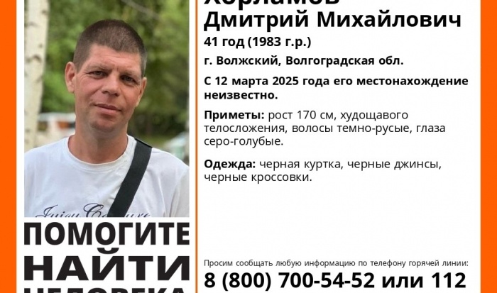 О местонахождении 41-летнего волжанина ничего не известно с 12 марта. В городе Волжском пропал без вести Дмитрий Михайлович Хорламов 1983 года рождения. К его поискам подключились волонтеры. Как сообщает поисково-спасательный отряд «ЛизаАлерт», приметы мужчины – это рост 170 см, худощавое телосложение, темно-русые волосы и серо-голубые глаза. На момент исчезновения он был одет в черные куртку, джинсы и кроссовки. Если у вас есть какая-либо информация о местонахождении Дмитрия Хорламова, просьба сообщить об этом организаторам поисков.