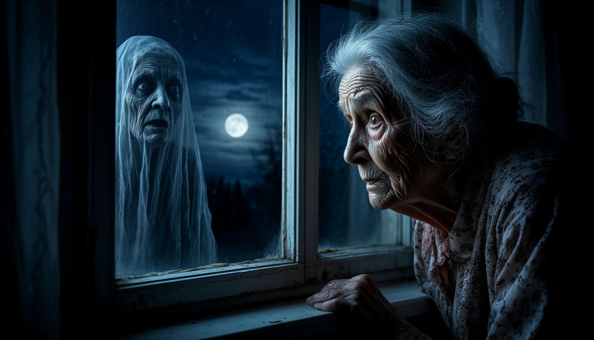 Услышав странные звуки, Катя включила фонарик на телефоне и вышла на улицу. Стоя в ограде, она подошла к углу дома и выглянула, но тут же закричала. Голос, словно неконтролируемый, вырвался из её уст. Перед женщиной стояла старуха. Белыми, как молоко, глазами она смотрела на Катю и тянула к ней руки. Последнее, что бросилось девушке в глаза, — как по лицу недавно умершей соседки ползали черви.