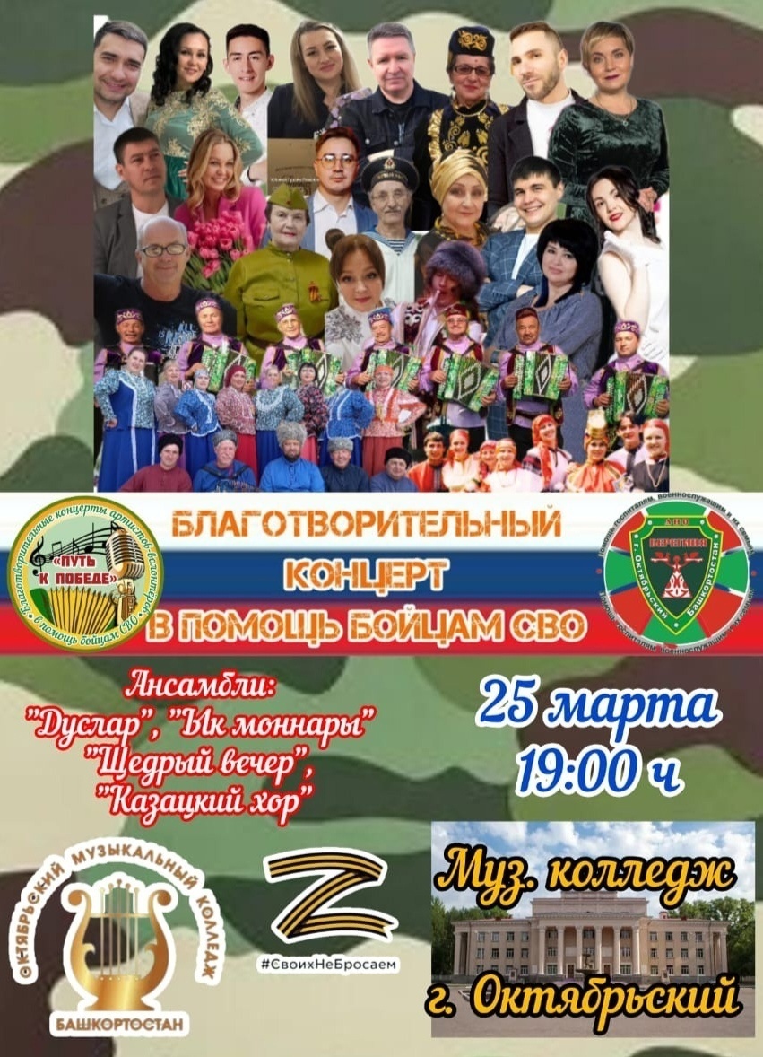 25 марта, в 19.00, в Октябрьском музыкальном колледже состоится благотворительный концерт в помощь бойцам спецоперации. В мероприятии примут участие творческие коллективы и солисты со всех уголков Башкирии и Татарии. Билеты можно приобрести в кассе музколледжа и онлайн (8-987-253-38-56, Сбер, Виктория Геннадиевна, с пометкой «Бойцам»). В день концерта у входа в зрительный зал будет стоять копилка для сборов в поддержку бойцов.