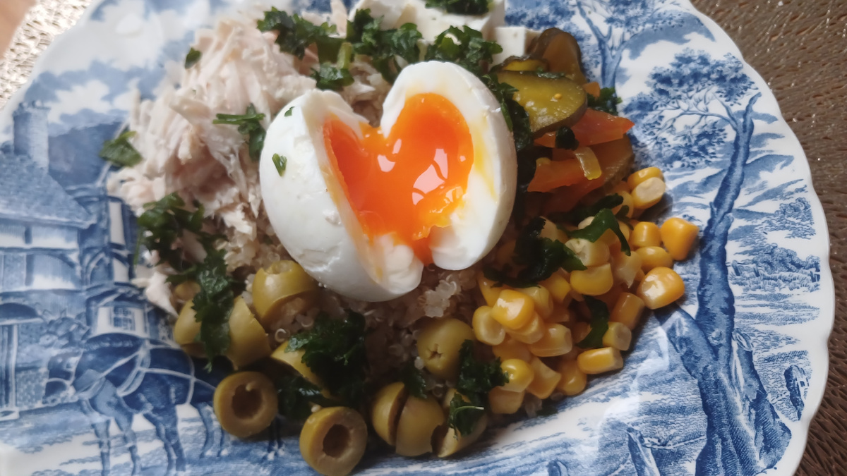 В среду завтракаем обычно боулом. Сегодня он у меня с киноа, добавки - вареная куриная грудка, яйцо, оливки, кукуруза, огурчики как в Маке, фета И к кофе были конфеты На обед - щи и сырный пирог. Все продукты собрала из холодильника и морозилки. В пироге адыгейский сыр, сулугуни, яйцо, укроп, болгарский перец маринованный - это начинка. Плюс листы лаваша, и ложка майонеза с кетчупом и тертый сыр - сверху для красивой корочки Потом кофе пила с пирожком из лаваша, начинка - груша, голубой сыр и сулугуни На ужин запекла скумбрию в фольге. Скумбрия из Вкусвилла, ну ооочень жирненькая и вкусная 👌 На гарнир сварена гречневая лапша и салат порезала (капуста, огурец маринованный, зеленый горошек) Меню год назад