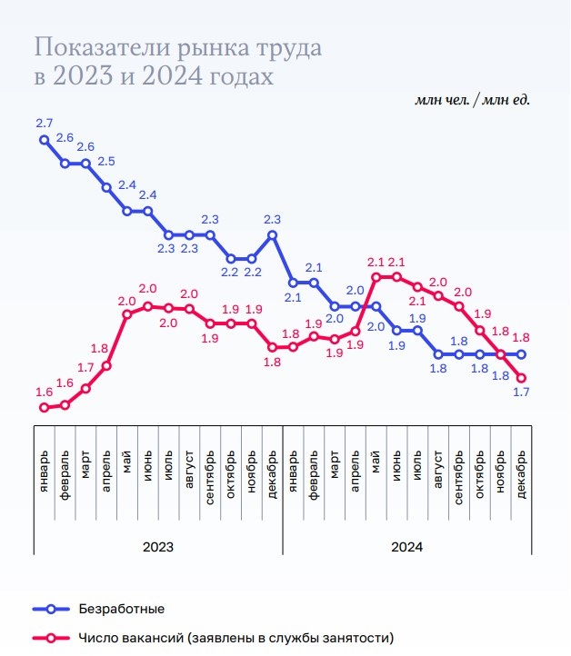 В отчете аудиторов Счетной палаты есть интересный график, наглядно демонстрирующий развитие кадрового кризиса в 2023-2024 годах. Он показывает сравнительную динамику числа безработных и числа вакансий. Тут видно, что весь 2023 и начало 2024 года количество безработных стремительно сокращается, а количество вакансий при этом растет. А с мая по ноябрь 2024 года наблюдается ситуация, которую аналитики Счетной палаты называют "уникальной": количество вакансий превосходит количество безработных. Длится эта ситуация полгода, количество вакансий постепенно снижается, и, наконец, к декабрю вновь оказывается ниже, чем количество безработных. При этом количество безработных всю вторую половину года не меняется, остановилось на одном уровне. Таким образом, динамика сравнения двух показателей не может говорить о том, что число вакансий снизилось, потому что компании нашли сотрудников и трудоустроили (в этом случае снижалось бы и число безработных). Снижалось только число вакансий, и это свидетел