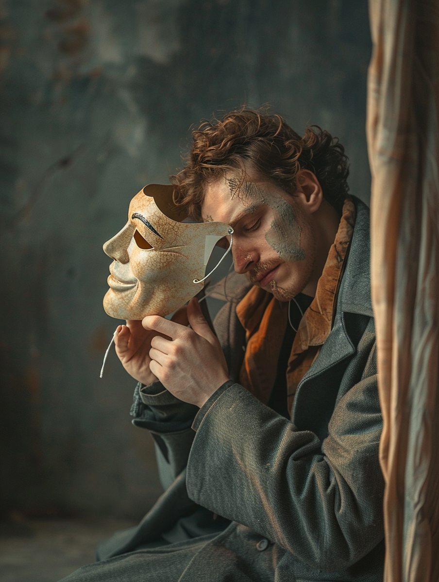 Как будто человек играет роль в чужом спектакле, надел чужой костюм, и есть вероятность, что все это может развалиться или как то не по настоящему.