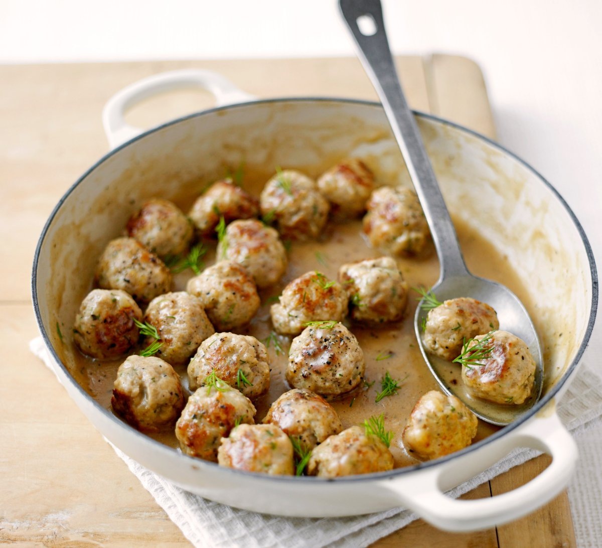 Лена залила фрикадельки белым соусом и отправила их в духовку.