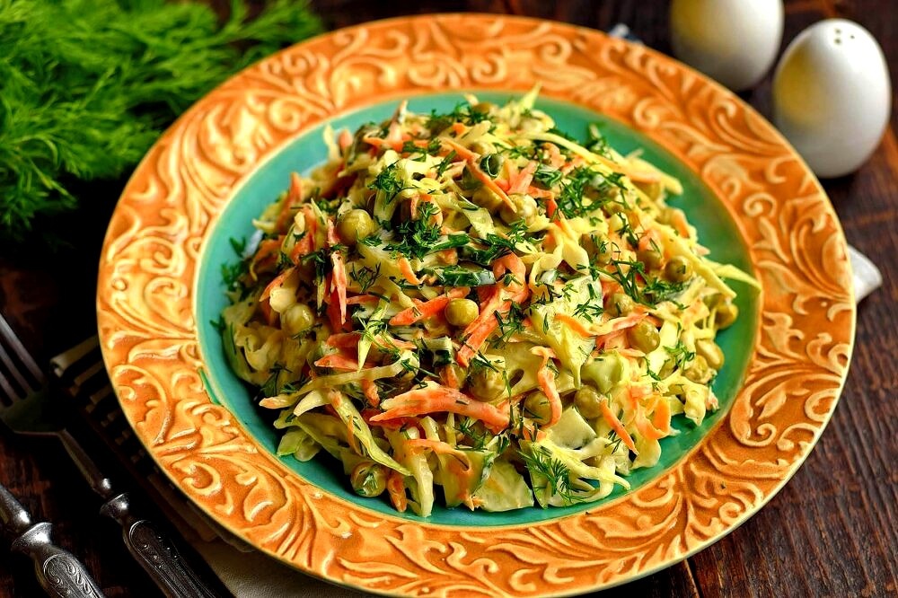 Салат «Овощное раздолье» Название салата "Овощное раздолье" говорит само за себя.В нём используются самые обычные и бюджетные овощи, которые дополняют друг друга и создают особый букет вкуса. Не откажите себе в тарелочке настоящих витаминов! Ингредиенты: Капуста белокочанная – 400 г Горошек зелёный консервированный – 150 г Огурцы свежие – 100 г Морковь – 100 г Лук зелёный – 50 г Укроп (зелень) – 4 веточки Майонез – 100 г Перец чёрный молотый – 1/3 ч.л. Соль – по вкусу Процесс приготовления: Капусту нашинковать тонкой соломкой. Морковь очистить и натереть на крупной тёрке. Смешать капусту с морковью, слегка посолить и чуть-чуть помять. Огурцы вымыть, разрезать вдоль на 4 части, а затем каждую четвертинку тонко нашинковать поперёк. Зелёный лук вымыть и нарезать тонкими колечками. Соединить подготовленные продукты, добавить горошек, поперчить и посолить. Всё перемешать и заправить майонезом .Салат перемешать. При подаче посыпать салат измельчённой зеленью укропа и украсить по своему усмот