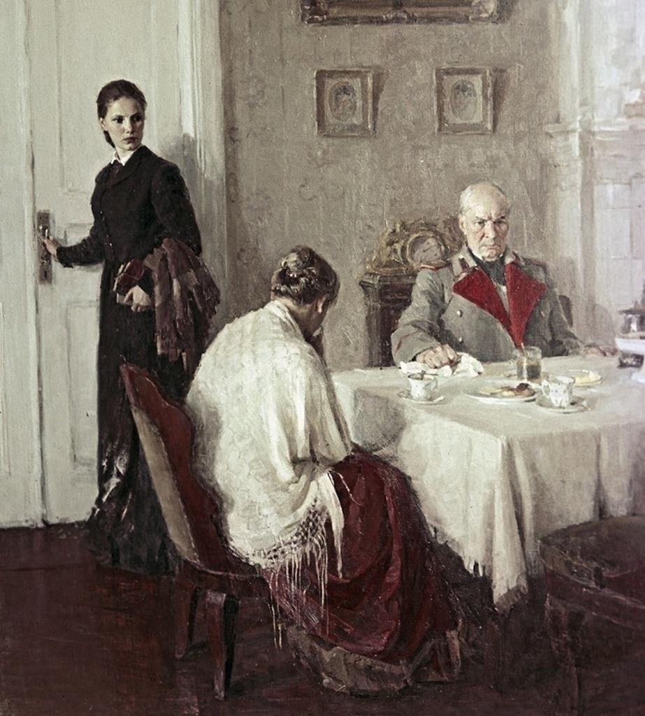 Избрание предначертанного пути – непростая задача. Оно сопряжено не только с преодолением общественных предрассудков, но и с личной жертвой, которую необходимо принести на алтарь будущих свершений. Картина «Софья Ковалевская» написана Мариной Ивановой в 1959-м году. Софья Васильевна – первая в мире женщина-профессор, лауреат большой премии Парижской академии, математик и механик, чьи открытия поспособствовали дальнейшему развитию точных наук. Сфера её интересов не ограничивалась решением задач и написанием научных трудов. Из-под пера одарённой женщины выходили стихи, мемуары и художественные романы. Однако путь к мировому признанию был тернист. На холсте изображён момент, когда юная Соня сообщает родителям о желании ехать заграницу (в ту пору Российской империи барышень в университеты ещё не принимали). Право отправиться в зарубежную поездку получали лишь замужние дамы, поэтому она решилась на фиктивный брак с учёным Владимиром Ковалевским, не предполагая, что фальшивый союз трансформи