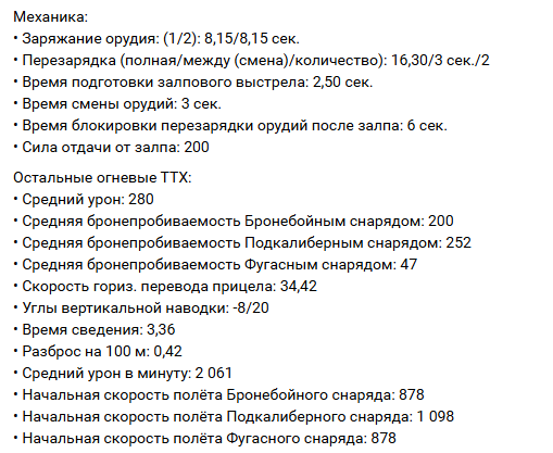 На танке стоят два орудия от Caernarvon (хотя визуально они вообще не похожи, и пробитие ББ ниже на 2мм). 280 урона, 218/252 (ББ/БП) пробития. Зарядка каждого ствола дольше ровно на секунду, чем одной пушки британца, но всё равно получается вполне пристойный ДПМ.
