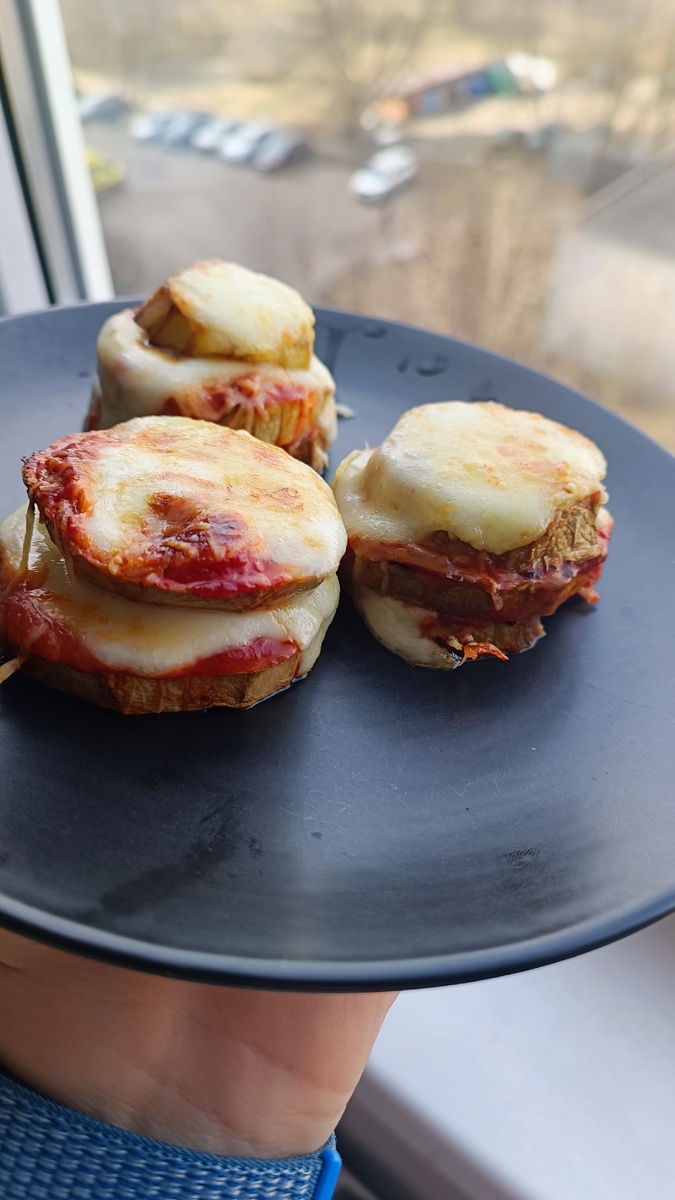 Не думала, что баклажаны можно приготовить так просто и в тоже время настолько вкусно. 🍆 Сам баклажан 2-3 штуки 🍅 Томатный соус 🧀 Любой сыр Очищаем баклажан от кожуры. Нарезаем на кольца по 5 мм, примерно Запекаем 10 минут на 200°С Достаем из духовки Берём один кружочек баклажана, смазываем томатным соусом, сверху сыр (у меня моцарелла), далее опять баклажан, соус, сыр. Три слоя вполне достаточно , а то будут падать. Сверху можно посыпать дополнительно сыром и в духовку на 10 минут. Получается очень вкусно😋👍🏻 Приятного аппетита.