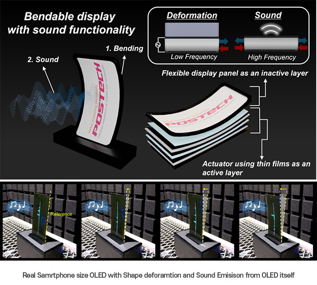 Ими разработана OLED-панель, которая является не только экраном, но и динамиком. Причем ориентировались они на наиболее перспективные гибкие экраны, так что разработка рассчитана именно на такие. А представляет она собой интеграцию ультратонкого пьезоэлектрического актуатора в слои стандартного экрана, например, смартфона. За счет электрических импульсов такой экран может принимать различные формы, а для воспроизведения звука — вибрировать. Если для изменения формы используются более низкие частоты, то для вибраций пойдут в дело высокие частоты.